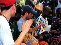 | Berklee student musicians with tribal drummers in Ghana during a summer trip to Africa | |