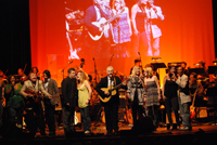 Christopher Guest (holding guitar) sings with Berklee student and faculty musicians during his tribute concert on December 1.