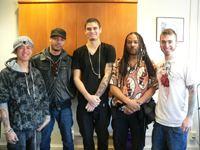 | Alumnus Warren Johnson '02 (far right) mixes sound for Ashlee Simpson and brought members of her entourage to Berklee for a visit. From the left: Poet, George Robertson (of InterScope Records), guitarist Ray Brady, faculty member Kenwood Dennard '76, and Johnson | |