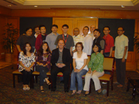 | Indonesian alumni met with President Roger Brown at the Sultan Hotel in Jakarta on March 8. Back row, left to right: Rezky Ichwan, Leonard Kristianto, Ricky Lionardi, Bernard Soetarman, Nial Djuliarso, Taufiq S., Angga Tarmizi, Stefen Thiele, Eramono Soekaryo, Kinolus Thenara, and Doddy Sukaman. Front row: Cynthia Kristianto, Lia Sundah Suntoso, Roger Brown, Meidi Ratnasari, and Rita Agustina Silalahi. | |