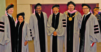 | From the left: Honorary doctor of music recipents Steve Winwood, Rosa Passos, Philip Bailey, and Maurice White, Berklee President Roger Brown, and doctorate recipient Howard Shore. | |