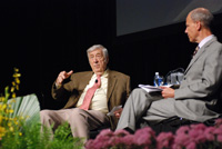 | Joe Mulholland, chair of the Harmony Department interviews legendary music scholar and composer Gunther Schuller (left). Schuller discussed his association with Duke Ellington among many other topics. | |