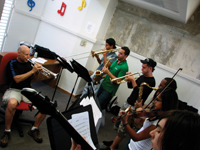 | Berklee Professor Ken Cervenka (seated) conducts a clinic held in tandem with the Puerto Rico Heineken Jazz Festival. | |