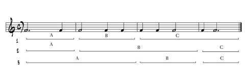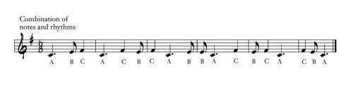 Example 2a illustrates this permutation with three rhythmic elements. Example 2b uses the three rhythms as well as three pitches.