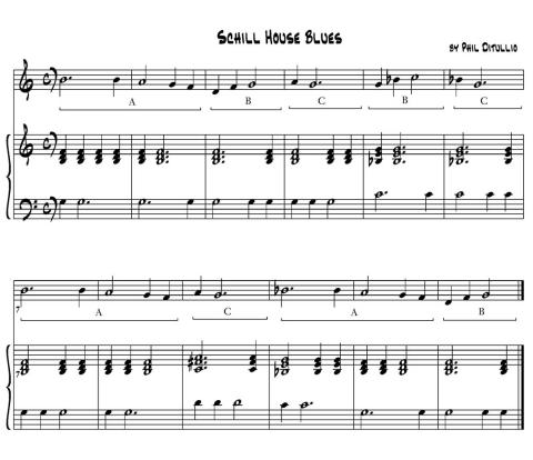 Example 4a shows the rhythmic pattern for a four-bar melodic phrase and the three possible groupings of the bars within the phrase. To construct a phrase, write three melodic elements based on the rhythm pattern. As previously, assign a letter to each element (A,B,C). Permute the elements in clockwise direction: ABC BCA CAB. Example 4b is a blues tune written this way. For this piece, I chose bar grouping 3 and adjusted the accidentals to fit the blues progression beneath.
