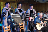 Matt Glaser, the artistic director of Berklee's American Roots Music Program; Berklee trustee Rusty Williams; and MP&E Professor Stephen Webber presented the award. During the ceremony, Glaser (on fiddle) and Webber (on ukelele) broke into the tune "When the Roses Bloom in Dixieland," the first song Watson ever learned, and the honoree joined in on guitar, and sang several verses. He also shared his thoughts on receiving the degree and explained how he got his nickname.