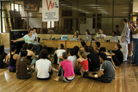 | Members of Danza Contemporánea de Cuba (seated on floor) and members of the InterArts Ensemble (with laptops) work together during a rehearsal. | |