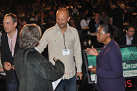 | David Hyman, the CEO and founder of MOG music service (center) talks with Rethink Music participants after a panel discussion on access and music "in the cloud." | |