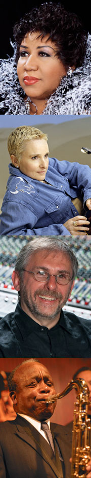 From left: honorees Andy McGhee, Elliot Scheiner, Melissa Etheridge '80, and Aretha Franklin with Berklee president Roger Brown.