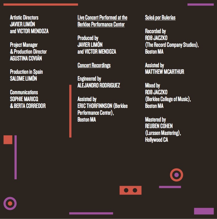 Featuring a band of 16 musicians from seven countries, with flamenco artists singer Saúl Quirós, singer Tamara Escudero, guitarrist Israel Cerreduela, percussionist Rafael Jiménez "El Chispas" and dancer Belén Lopéz considered the young talents of this musical tradition. The November 2011 concert at the Berklee Performance Center was sold out and the band spent a week in a recording studio chronicling this unique musical experience for the first MMI Recording.