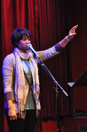 Jazmin McCray earned the distinction of slam champion. The vocalist from Poughkeepsie, New York performed "Girl, I'm Sorry," a poem about finding out a guy you like has a girlfriend, and "Royalty," a poem McCray described as her own "personal anthem" about self-respect. She also performed "Computer Love" with classmate Scott Kapelman, a clever play-on-words tribute to the Mac laptop.