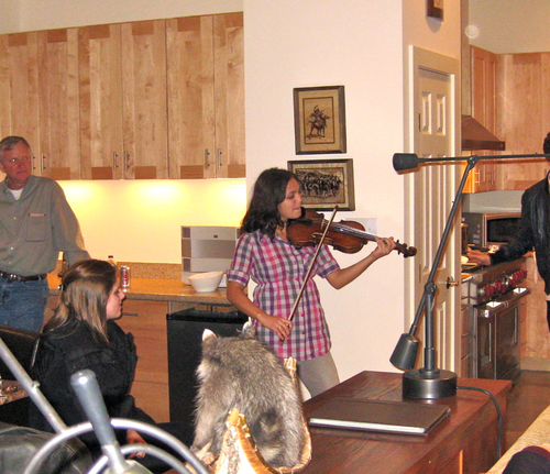Make that triple duty for Nini & Ben, who also performed a semi-acoustic set at Berklee's third event of the week, a cookout hosted by trustee David Clem and his wife Kathy—attended by Berklee president Roger Brown, alumni, parents, students, faculty, and staff—at the Clems' ranch 35 miles outside of Austin. After guests devoured fabulous home-cooked barbeque, student violinist Ada Pasternak gave an impromptu performance that included a Béla Fleck tune.