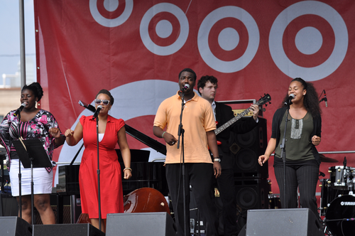 Faculty vocalist Gabrielle Goodman and her 10-member group (featuring four background vocalists) roused a growing Target Stage crowd for a heady spin through feel-good soul, r&b, bluesy Tin Pan Alley, and other selections.