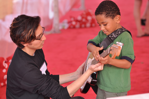 A budding guitarist receives a lesson from a Berklee student at the instrument petting zoo.