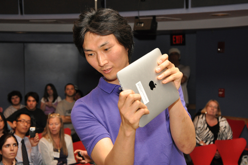 Student Jin Ku Kim shows off the musical possibilities of an iPad at the first Music Therapy Technology Symposium.