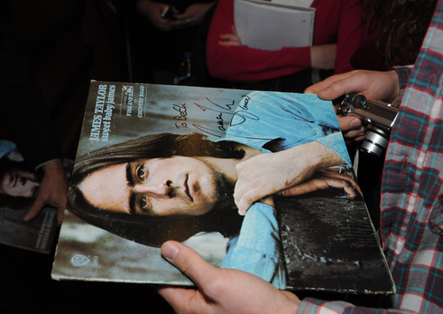 James Taylor signs a copy of his famous album <em>Sweet Baby James</em> "James Taylor (once)."
