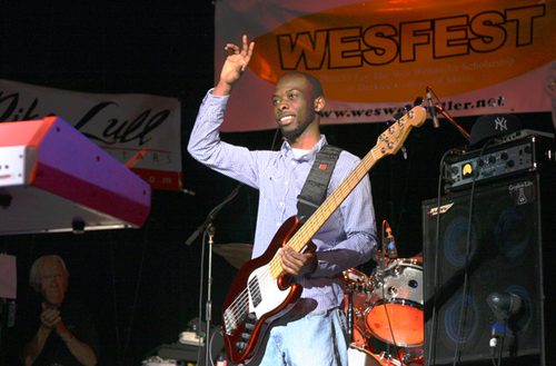 In a long-standing WesFest concert tradition, the 2010 Wehmiller Scholarship winner performed at WesFest 6. Bassist Joshua Tyson of East Orange, New Jersey brought a deep sense of groove to the show, anchoring a band of mostly Berklee graduates led by Wehmiller's Berklee bass professor and close friend Danny Morris. Morris is instrumental in selecting the scholarship winner and leads a separate annual concert event in Boston to increase awareness of the scholarship among the Berklee student body. "One of the great pleasures in preparing for WesFest each year is the rehearsal the day prior," says Morris. "It's there that I truly witness the musicianship and personality of the scholarship recipient. Joshua Tyson understands ebb and flow, how to take the listener on a musical journey, and his set-ending solo gave the audience a taste of his groove, originality, soul, and rhythmic beauty."