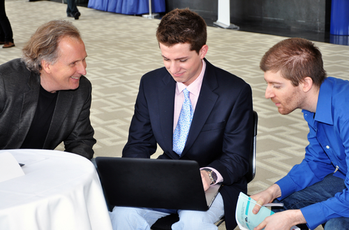 Berklee president Roger H. Brown checks out music online with students Charlie Puth and Ben Camp.