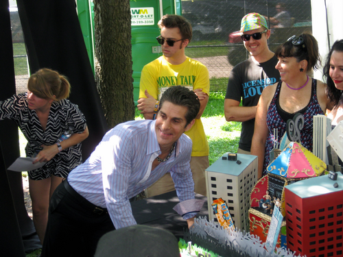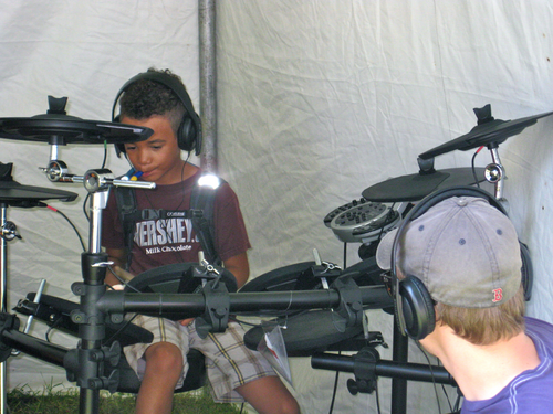 HRR staff member Alex Wright plays a silent concert with a young drummer at Berklee's Kidzapalooza tent.