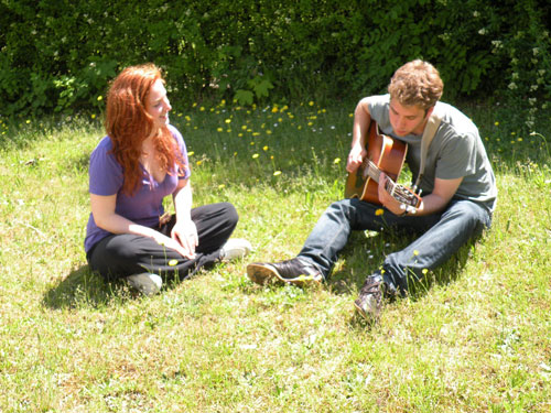 Casty and Berklee classmate Leah Dennis jam outside the Goethe-Institut, which hosts the Berklee study abroad students in its dormitories.