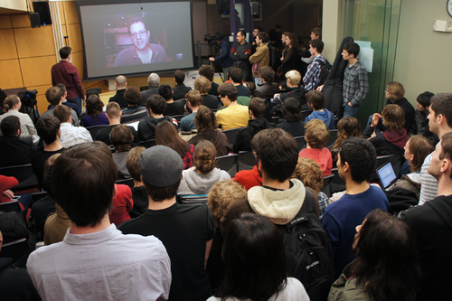 So many people crammed into the Media Lab to see Michael Giacchino that he called it "Occupy Berklee." The Oscar-winning composer for Up, Star Trek, The Incredibles, Lost, and more visited the college from the Warner Brothers Studio in Los Angeles via Skype for a late-semester Learning Center forum, thanks to Alexander Arntzen and Juan Carlos Enriquez of Berklee's Film Scoring Network.
