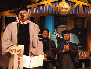 Next, the Opry crowd watched a brief video in which President Roger H. Brown described the acoustic string principal at Berklee. Lawrence J. Simpson, senior vice president for academic affairs, and trustee Jeff Davis made the presentation to Skaggs. Following the ceremony, Skaggs, still wearing the robe, grabbed his mandolin and closed out the Opry show by playing "Bluegrass Breakdown."