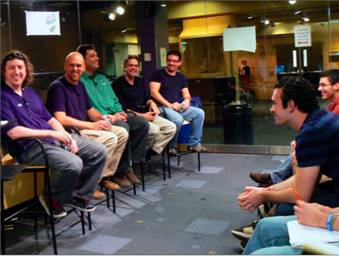 The panel, from left to right: Scott Haraldsen, Jim Bonney, Gene Rozenberg, Michael Sweet, and Duncan Watt.