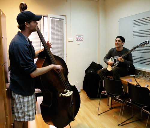 Greg Feingold and Ryan Toll jam in a practice room at Nakas.
