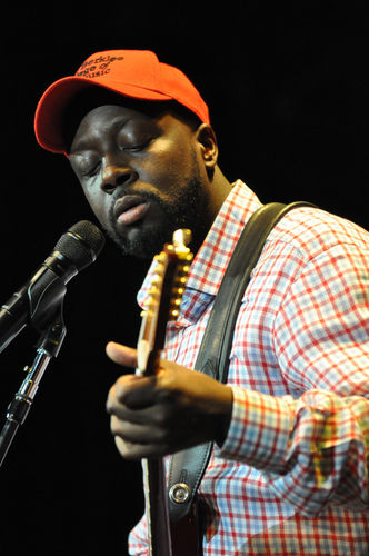 Wyclef Jean performs with students. From left, Hari on bass and Lopez on percussion, Jean, guitarist Rene DelFiero, and student turntablist DJ V Fresh.