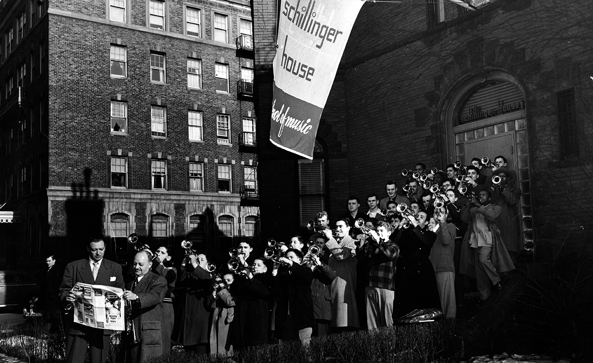 Despite the emergence of bebop—jazz intended primarily for listening—the public hadn’t lost its appetite for danceable tunes. In 1948, Schillinger House created two dance orchestras, giving students the chance to hone their skills off campus at venues throughout the Boston area. One ensemble was led by Joe Viola, who would go on to become the founding chair of the Woodwind Department and teach or mentor many notable students, from Quincy Jones ’51 and Herb Pomeroy ’52 to Joe Lovano ’72 and Donald Harrison ’81, over the course of his 49-year Berklee career. The other was led by Freddie Guerra, a former member of Glenn Miller’s Army Air Force Band in Europe during World War II. A particularly influential figure for Schillinger House students in the late ’40s (according to a poll from the first issue of The Score, the school’s student newspaper) was Woody Herman. One of the first big-band leaders to incorporate the language of bebop into his music, Herman would become a frequent visitor to Berklee over the years. At the college’s 1977 commencement, Berklee presented a wheelchair-bound Herman with an honorary doctorate. Injured in a car accident shortly before the ceremony, Herman told Lawrence Berk that he’d attend commencement “if I have to be carried in on a stretcher.” —Nick Balkin