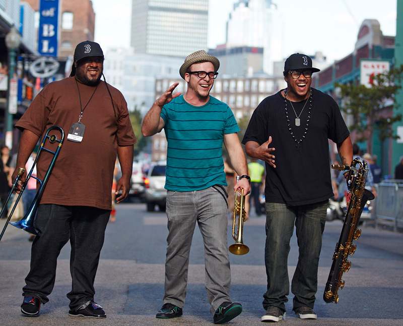 Berklee alumni (from left to right) Kevin Williams B.M. ‘03, Sean Erick B.M. ‘06, and Leon Silva Jr. B.M. ‘07 (the Regiment Horns) backed Justin Timberlake on a medley to open the 2017 Oscars.