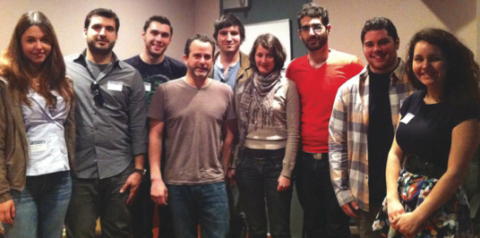 Film composer Geoff Zanelli ’96 (fourth from the left) of Remote Control Productions met with a group of Berklee film scoring students in March.