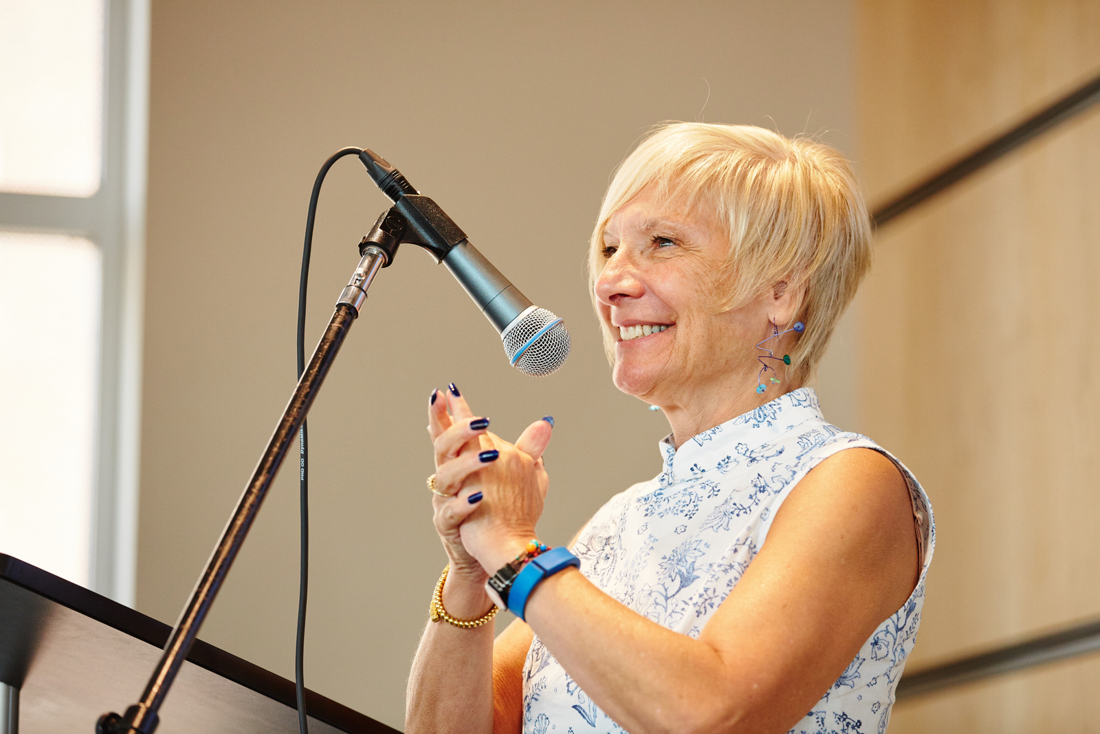 Suzanne Hanser, chair of Berklee's Music Therapy Department, speaks during graduate student orientation.