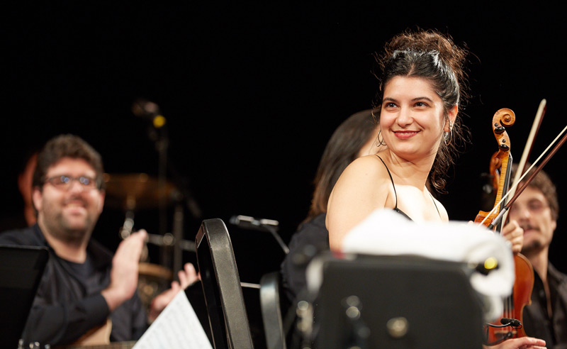 At a recent concert celebrating the music of iconic Brazilian guitarist Toninho Horta, student violinist Bengisu Gokce, who hails from Istanbul, Turkey, plays each arrangement of the night along with a shining string section comprising fellow Berklee students: violinists Heeyeon Chung (Columbus, Ohio), Antoine Beux (Paris, France), Emily Gelineau (Perth, Australia), and Tania Mesa (Canary Islands, Spain); violists Gerson Eguiguren (Quito, Ecuador) and Louisa Byron (Waseca, Minnesota); and cellist Parker Ousley (Northfield, Minnesota).