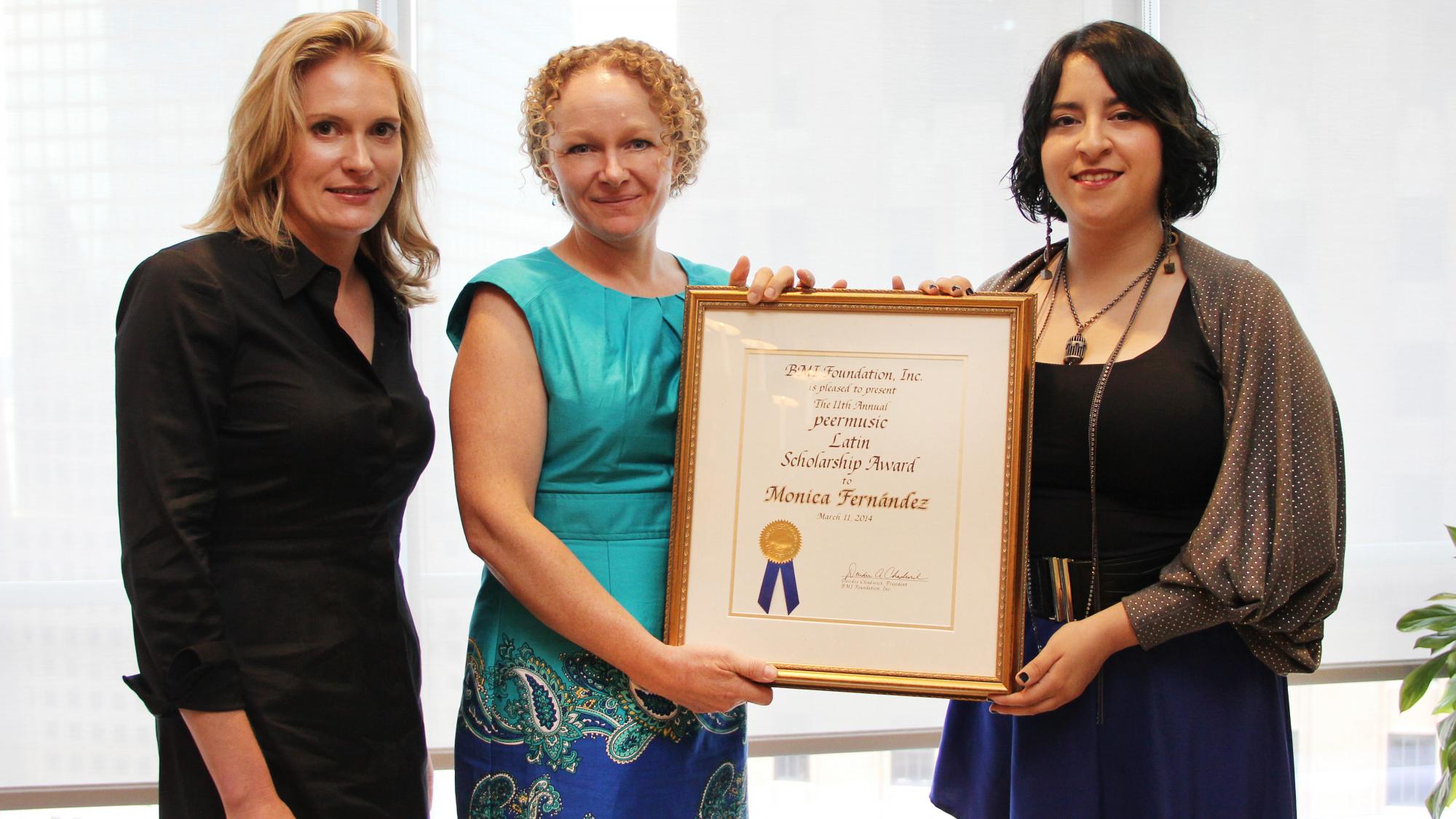 Porfirio Piña, director of the BMI Foundation's peermusic Latin Scholarship, has announced that Monica Fernandez is the winner of the 11th annual peermusic Latin Scholarship, a competition for original Latin songs and instrumental compositions. Fernandez, a native of Monterrey, Mexico, received the $5,000 scholarship for her song “Sepia.” The scholarship was presented at a private award ceremony at the BMI New York City office on July 9, 2014.