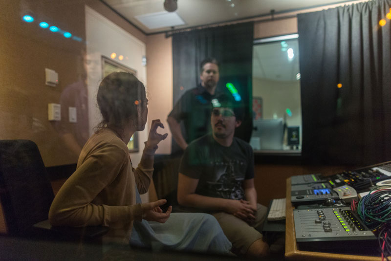 Artist Jesca Hoop listens to audio captured during the soundcheck for her Cafe 939 show with BIRN studio manager Ryan Walsh (foreground) and MP&E assistant professor and BIRN faculty advisor Chad Blinman.