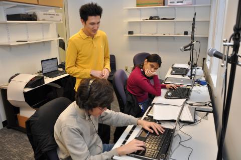 Chi Gook Kim works with students in Berklee’s assistive music technology lab.