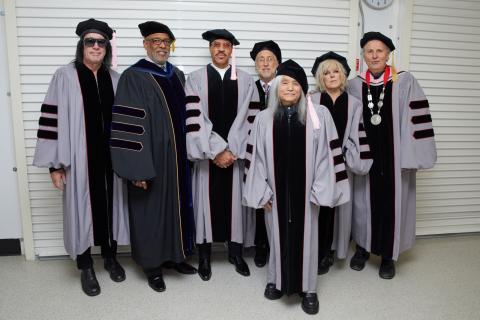 Berklee honorary doctorate recipients and presenters, from left to right: Todd Rundgren, Larry Simpson, Lionel Richie, Neil Portnow, Shin Joong Hyun, Lucinda Williams, and Roger H. Brown