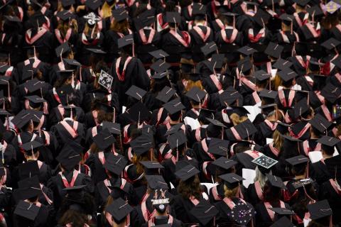 More than 1,000 graduates in black caps and gowns attend the May 13 commencement exercises at Boston University’s Agganis Arena.