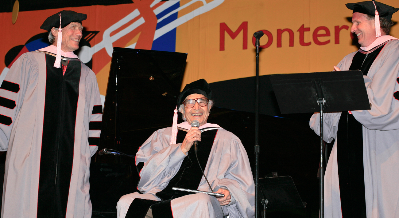 Clint Eastwood, left, and president Roger H. Brown (right) present a Berklee honorary doctorate to Dave Brubeck at the 2009 Monterey Jazz Festival.