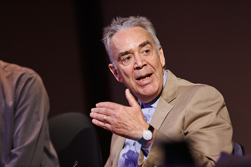 Howard Shore speaks with Alison Plante, assistant chair of the Film Scoring Department, during a panel discussion the day after the concert.