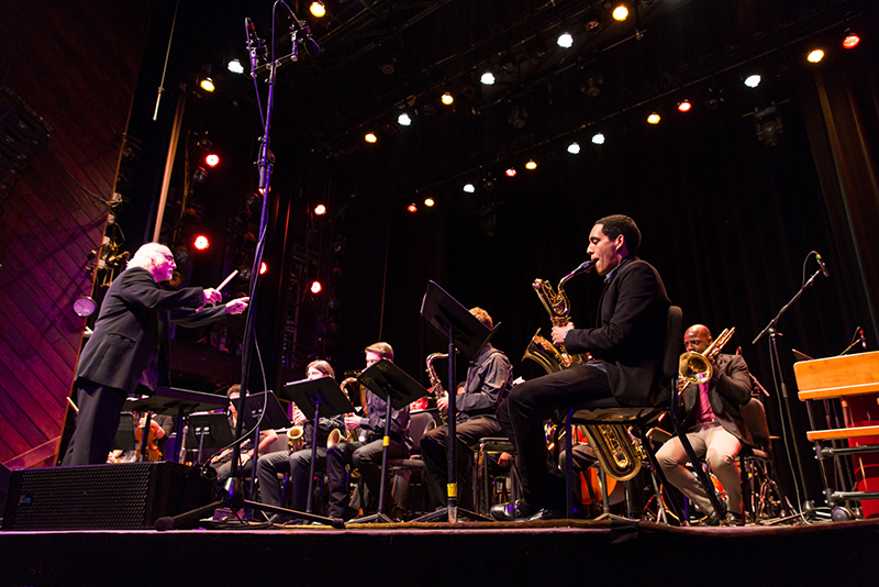Greg Hopkins, professor of jazz composition, leads the Berklee Concert Jazz Orchestra with Berklee student Luis Garcia on baritone saxophone in the foreground.