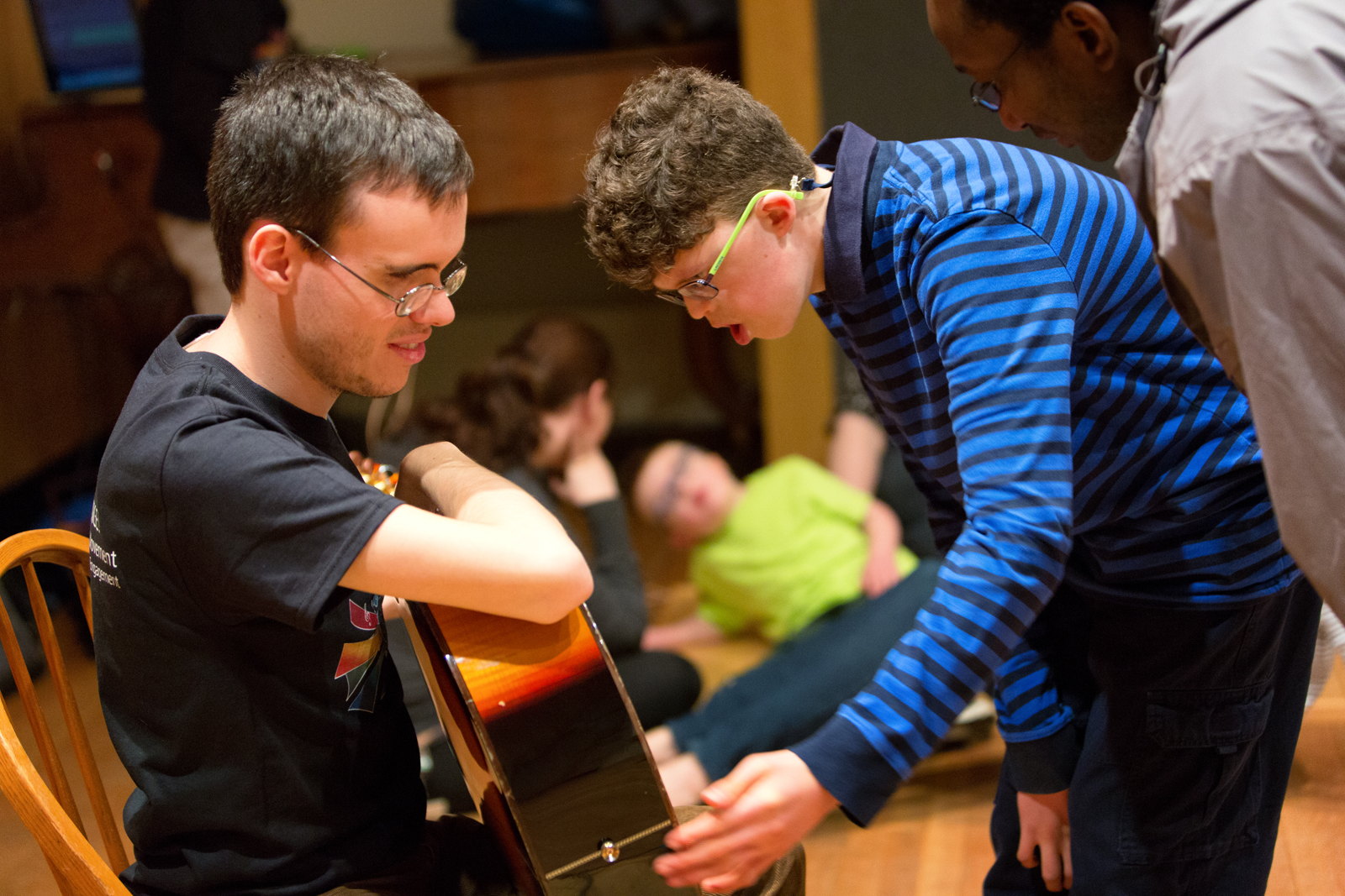 A few feet away, a boy named Tim moved his hands across an electric guitar being idly strummed by Noe Socha ’13. The recent graduate is now a teaching assistant in Berklee’s assistive music technology lab, which is equipped for visually impaired students.