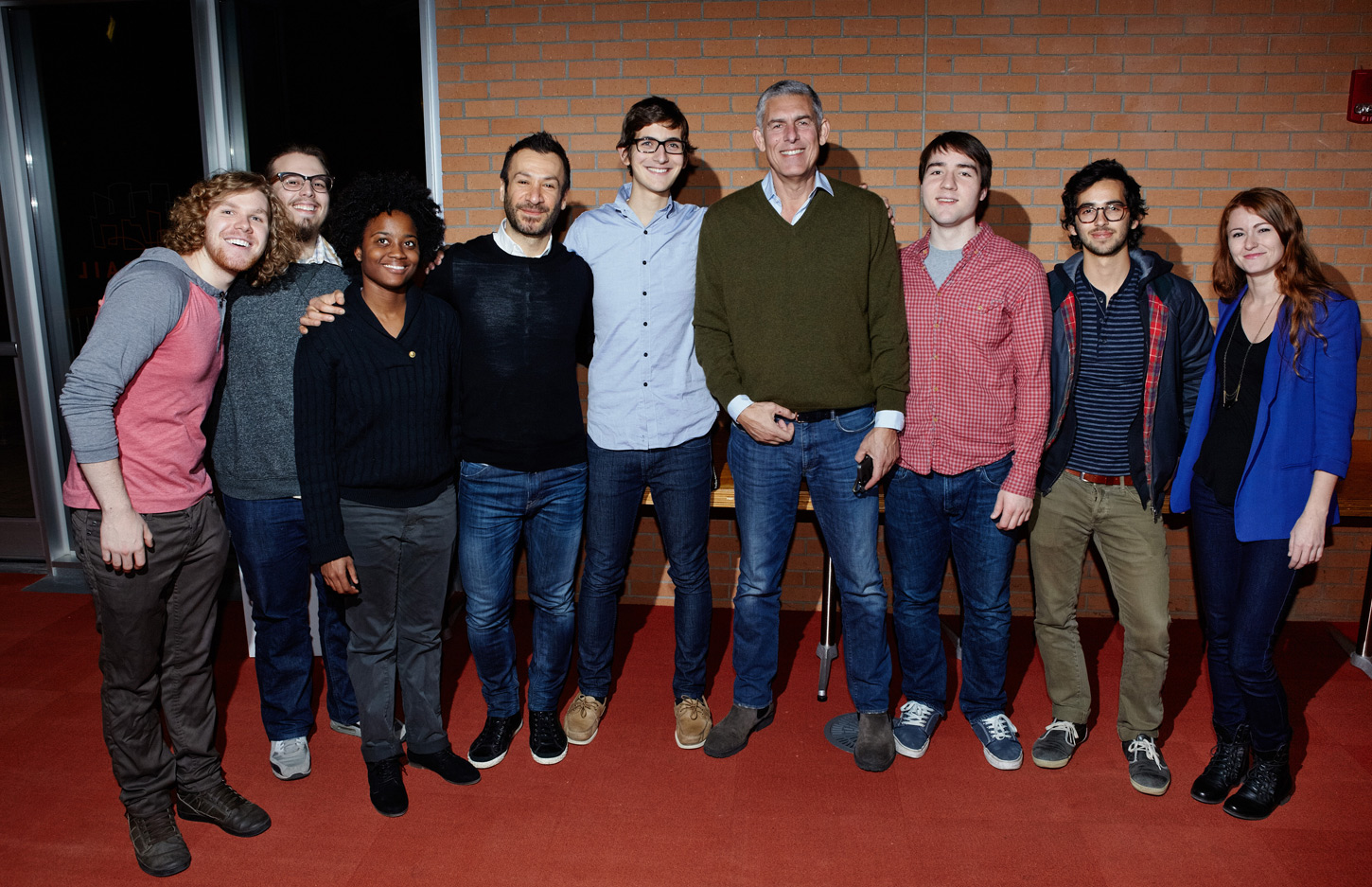 Berklee students pose with Panay and Cohen. From left to right: Nash Atkins, Paul Garcia, Myrish Spell, Panos Panay, Kyle Billings, Lyor Cohen, Seth Bella, Jose Parody, Melanie Stevenson.