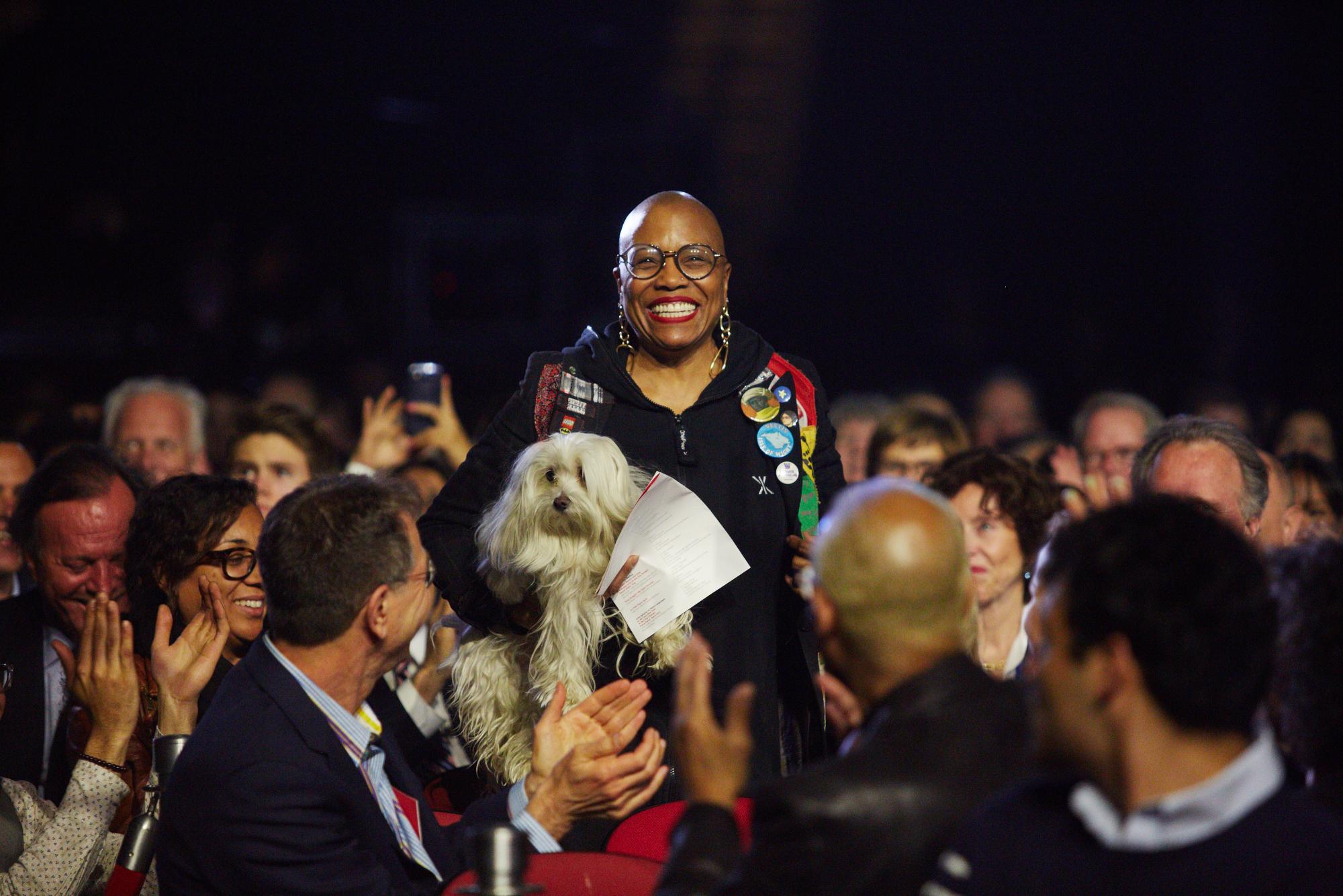 Commencement speaker Dee Dee Bridgewater and her dog wave to the audience during the commencement concert.