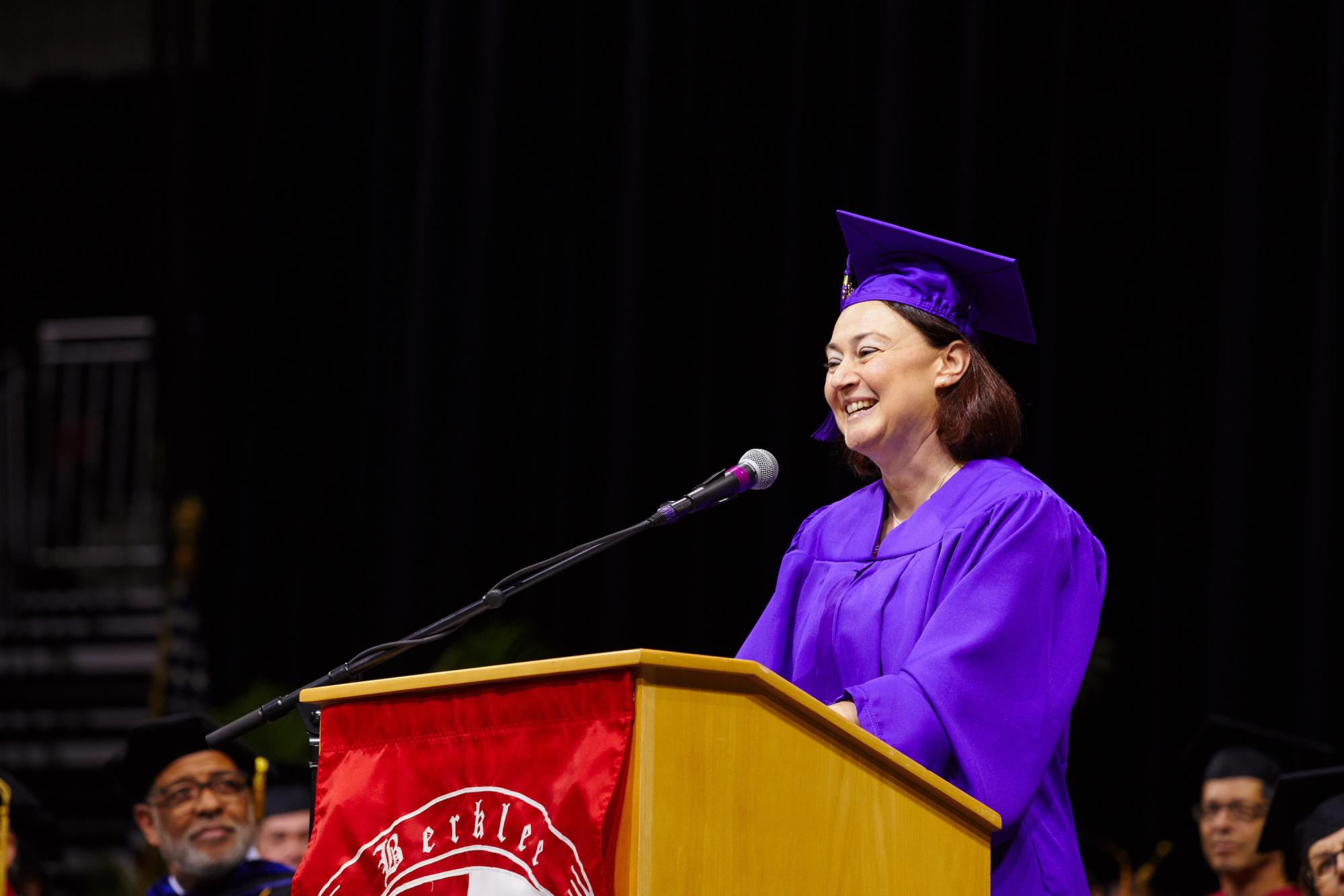 Rapper, singer, songwriter, and producer Missy Elliott, a four-time Grammy Award winner whose U.S. sales have surpassed 30 million, was praised in President Brown’s introduction for bending genres, breaking stereotypes, and pushing musical, visual, and stylistic boundaries. Elliott is the first hip-hop artist to receive Berklee’s honorary doctorate.