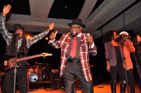 Acclaimed actor and best-selling children’s author Jamie Lee Curtis engaged the crowd as master of ceremonies while Grammy Award–winning artist, composer, and producer George Clinton H ’12 and Parliament-Funkadelic performed hits like "Flashlight" and "We Want the Funk." Legendary bandleader and trombonist Fred Wesley, a member of James Brown’s band in the 1960s and 1970s and later with Parliament-Funkadelic, performed hits from his career as well. Partygoers dined and danced to the sounds of over 150 faculty, alumni, and student musicians performing salsa, a cappella, big band, jazz, pop, and blues. Ray Greene '96, vocalist with Tower of Power, performed with Berklee's Tower of Power ensemble. Berklee alumni group Los Rumberos de Boston got the crowd dancing with its Afro-Cuban rhythms, and bluegrass artist Sierra Hull '11 performed selections from her albums.