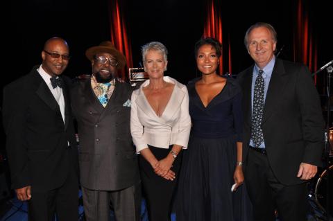 Pictured from left: executive director Berklee City Music Curtis Warner, George Clinton, master of ceremonies Jaime Lee Curtis, dean of City Music Krystal Banfield, Berklee president Roger Brown.