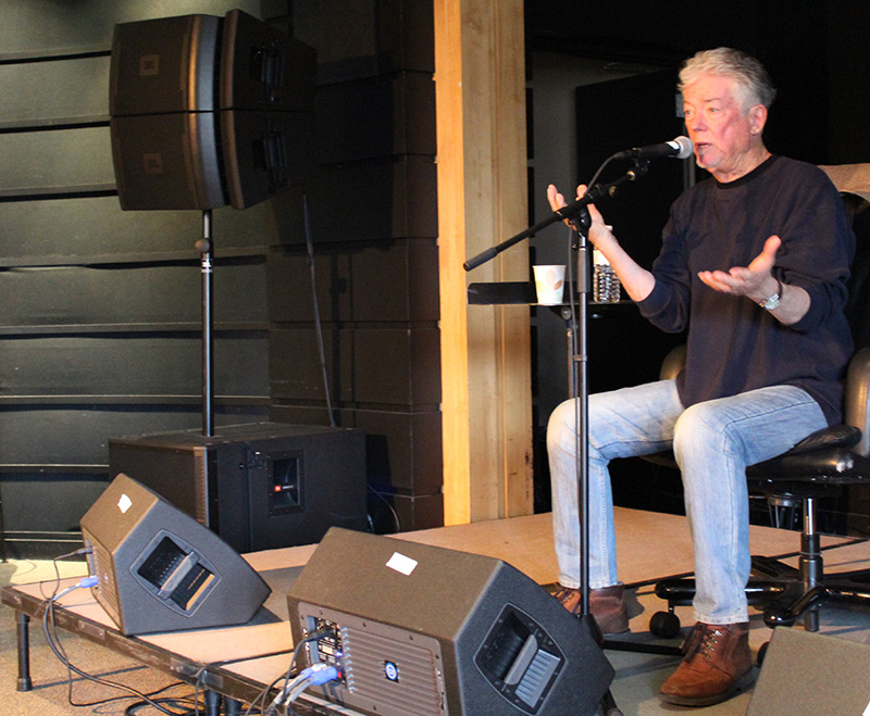 Hit songwriter Gary Burr speaks to Berklee students as Pat Pattison shepherds student questions. “We’re in the lottery business,” Burr said of the Nashville songwriting community. “Every day, we write up a new lottery ticket, and you can’t skip a day.”