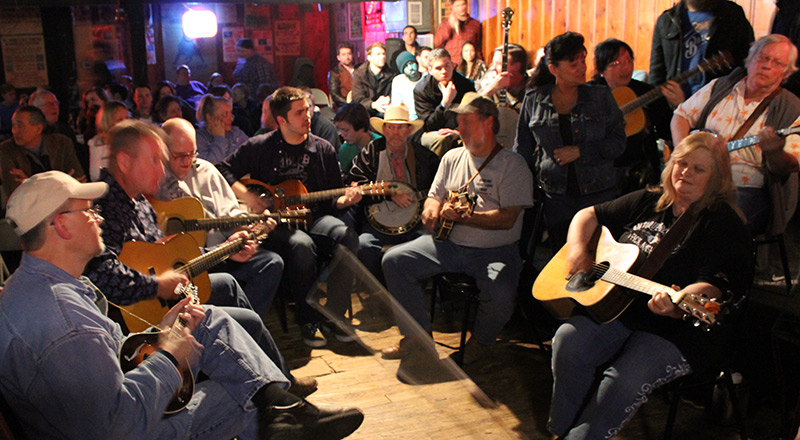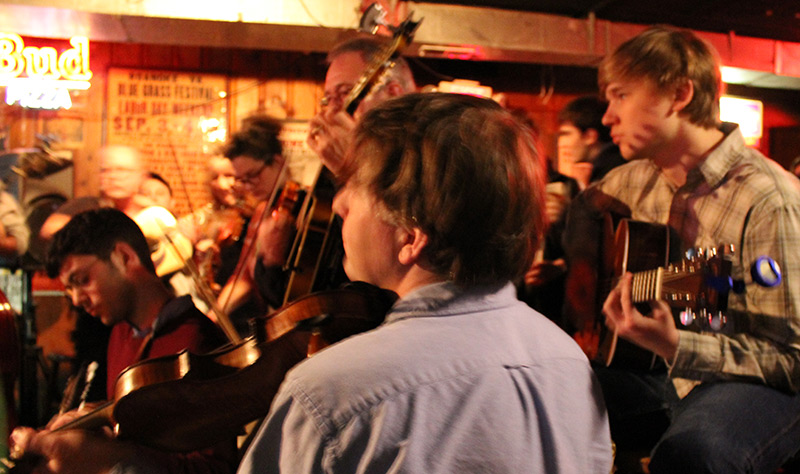 Berklee student Bill Grady (center left) sits in on the bluegrass jam with some of Nashville’s finest.